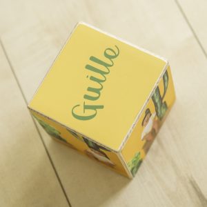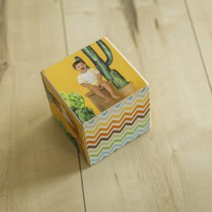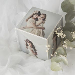 Dado de madera de 10×10 consta de 4 fotos y la parte de abajo la protegemos con una tela lisa de color.