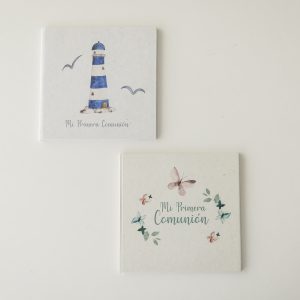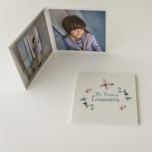 Cartonaje forrado en 13×13 decorado. Dos fotos interiores papel fotográfico máxima calidad. Se entrega con bolsita de organza.