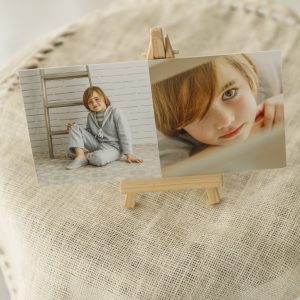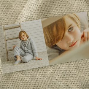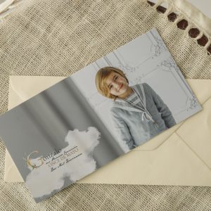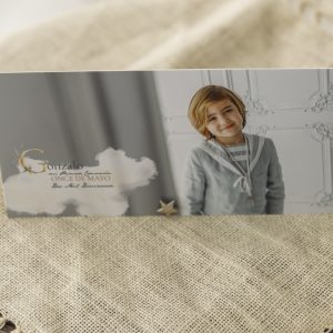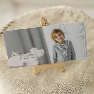 Recordatorio en papel fotográfico ploteado de alta calidad de doble cara. Foto contra foto en formato rígido. Contiene 3 fotos. Incluye texto con la fecha y tipo de evento (muy usada en bautizos, comuniones, primer cumpleaños) en una de sus caras.