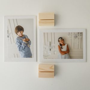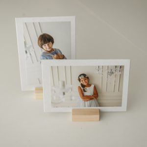 Recordatorio en papel fotográfico de 10×15 sobre un cartonaje rígido. Se soporta con una peana de madera de pino cuadrada. la entrega es en bolsita de organza