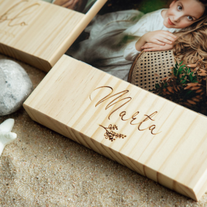 Taco de madera de Pino grabado con laser personalizado. Fotografía de 10×15. Tamaño terminado 15×15. Acabado perfecto